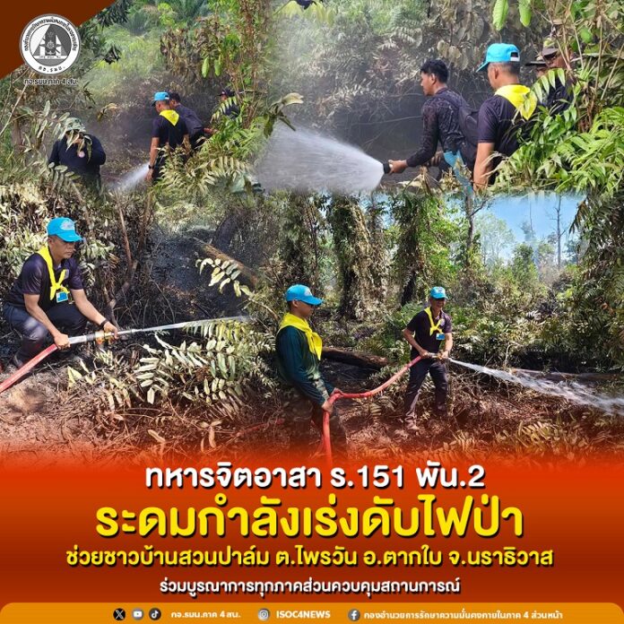 เมื่อวันที่ 21 มีนาคม 2569 เวลา 08.00 น. กองพันทหารราบที่ 2 กรมทหารราบที่ 151 นำกำลังพลจิตอาสา ลงพื้นที่ให้การช่วยเหลือประชาชนในการควบคุมและดับไฟป่า บริเวณสวนปาล์มน้ำมันของชาวบ้านในพื้นที่หมู่ที่ 7 ตำบลไพรวัน อำเภอตากใบ จังหวัดนราธิวาส โดยมี นายบุญช่วย หอมยามเย็น ผู้ว่าราชการจังหวัดนราธิวาส ลงพื้นที่ติดตามสถานการณ์ไฟไหม้ป่าชุมชนอย่างใกล้ชิด พร้อมกำชับทุกหน่วยงานที่เกี่ยวข้องให้เพิ่มความเข้มงวดในการเฝ้าระวังและป้องกันไฟป่าอย่างต่อเนื่อง เพื่อบรรเทาความเดือดร้อนและลดผลกระทบที่อาจเกิดขึ้นกับพี่น้องประชาชนในพื้นที่