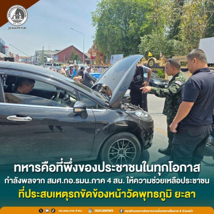 [จังหวัดยะลา – 27 มีนาคม 2569] – เมื่อเวลา 11.00 น. ที่ผ่านมา ขณะที่เจ้าหน้าที่จากสำนักมวลชนและกิจการพิเศษ กองอำนวยการรักษาความมั่นคงภายในภาค 4 ส่วนหน้า (สมศ.กอ.รมน.ภาค 4 สน.) กำลังปฏิบัติหน้าที่ในเขตพื้นที่อำเภอเมือง จังหวัดยะลา ได้พบรถยนต์ส่วนบุคคลของสุภาพสตรีมุสลิมรายหนึ่ง เกิดเหตุขัดข้องทางเทคนิคจนหยุดชะงักอยู่บนถนนหน้าวัดพุทธภูมิ ซึ่งเหตุการณ์ดังกล่าวะส่งผลให้การจราจรเริ่มติดขัด เนื่องจากผู้ประสบเหตุไม่สามารถเคลื่อนย้ายรถยนต์ได้ด้วยตนเอง