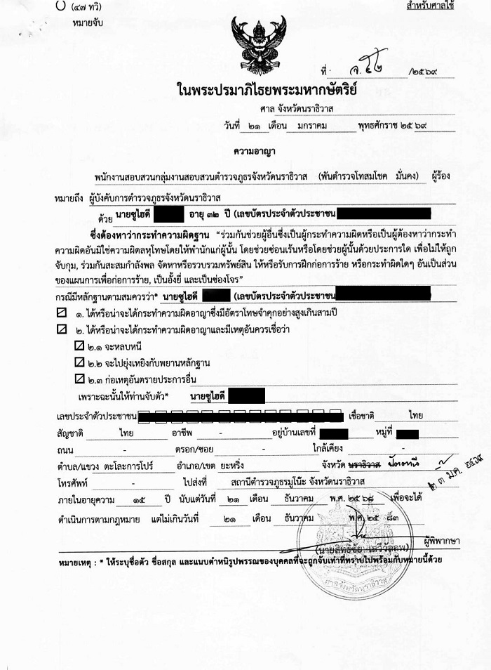ทั้งนี้ การควบคุมตัวดังกล่าวเป็นไปตามหมายจับตามประมวลกฎหมายวิธีพิจารณาความอาญา ในข้อหาร่วมกันช่วยผู้อื่นกระทำความผิด ซึ่งเกี่ยวข้องกับเหตุการณ์ในพื้นที่จังหวัดนราธิวาส โดยเจ้าหน้าที่ได้ดำเนินการตามขั้นตอนของกฎหมายอย่างเคร่งครัด