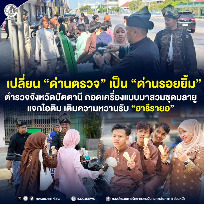 บรรยากาศที่ด่านตรวจบริเวณซุ้มประตูเมือง ตำบลสะบารัง อำเภอเมือง จังหวัดปัตตานี ในช่วงเทศกาลฮารีรายออีฎิ้ลฟิตรี ปี 2569 นี้ สะท้อนภาพความเปลี่ยนแปลงที่น่าประทับใจ จากพื้นที่ที่เคยถูกมองว่าเคร่งครัดด้านความปลอดภัย กลับกลายเป็นพื้นที่แห่งความอบอุ่นและรอยยิ้มของประชาชนในพื้นที่ เมื่อ พันตำรวจเอก ฟาฮามี เฮ็งปิยา ผู้บังคับการหน่วยเฉพาะกิจตำรวจปัตตานี 92 และเจ้าหน้าที่ตำรวจ ได้ร่วมกัน “ถอดเครื่องแบบ” และสวมใส่ชุดมลายูพื้นถิ่น เพื่อร่วมเฉลิมฉลองเทศกาลสำคัญของพี่น้องชาวมุสลิม พร้อมทั้งจัดกิจกรรมแจกไอศกรีม ขนม และน้ำดื่ม ให้กับประชาชนที่สัญจรผ่านไปมา