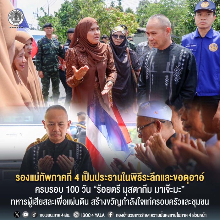 วันนี้ (23 มีนาคม 2569) เวลา 11.00 น. ณ บ้านสุแฆ หมู่ที่ 3 ตำบลดุซงญอ อำเภอจะแนะ จังหวัดนราธิวาส พลตรี ชาคริต อุจะรัตน รองแม่ทัพภาคที่ 4 / รองผู้อำนวยการรักษาความมั่นคงภายในภาค 4 ส่วนหน้า เป็นประธานในพิธีระลึกและขอดุอาอ์ (ขอพร) ครบรอบ 100 วัน แด่ ร้อยตรี มุสตากีม มาเจ๊ะมะ วีรบุรุษทหารกล้าชาวนราธิวาส ผู้พลีชีพจากการปฏิบัติหน้าที่ปกป้องอธิปไตยของชาติ ณ สมรภูมิช่องอานม้า เมื่อวันที่ 13 ธันวาคม 2568 ผู้เป็นทหารที่เสียสละเพื่อแผ่นดิน โดยมี ผู้บังคับบัญชา หัวหน้าส่วนราชการ ผู้นำศาสนา ครอบครัว ญาติพี่น้อง เพื่อนทหาร และพี่น้องชาวไทยมุสลิมในพื้นที่ เข้าร่วมอย่างพร้อมเพรียง