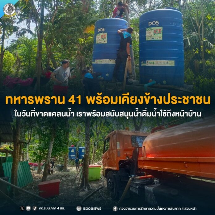 วันที่ 28 มีนาคม 2569 เวลา 13.00 น. หน่วยเฉพาะกิจกรมทหารพรานที่ 41 จัดกำลังพล ชุดปฏิบัติการกิจการพลเรือน กองร้อยทหารพรานที่ 4113 ร่วมกับฝ่ายส่งกำลังบำรุง ลงพื้นที่ช่วยเหลือประชาชนที่ประสบปัญหาภัยแล้ง ส่งผลให้ขาดแคลนน้ำอุปโภคบริโภค โดยได้สนับสนุนน้ำเพื่อบรรเทาความเดือดร้อนในเบื้องต้น ให้กับประชาชนในพื้นที่ หมู่ที่ 1 และหมู่ที่ 5 ตำบลวังพญา อำเภอรามัน จังหวัดยะลา