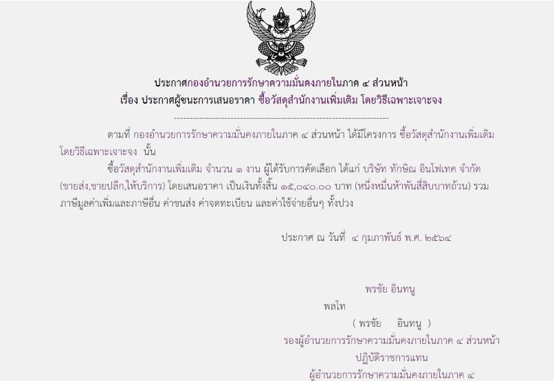 ประกาศผู้ชนะการเสนอราคา ซื้อวัสดุสำนักงานเพิ่มเติม โดยวิธีเฉพาะเจาะจง (15,040.00)