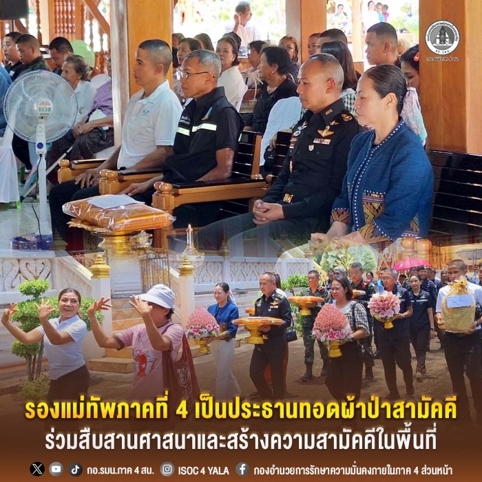 วันที่ 29 มีนาคม 2569 เวลา 10.30 น. พลตรี ชาคริต อุจะรัตน รองแม่ทัพภาคที่ 4 /รองผู้อำนวยการรักษาความมั่นคงภายในภาค 4 ส่วนหน้า เป็นประธานในพิธีทอดผ้าป่าสามัคคี ณ วัดสารวัน ตำบลไทรทอง อำเภอไม้แก่น จังหวัดปัตตานี เพื่อร่วมทำนุบำรุงพระพุทธศาสนา สืบสานประเพณีอันดีงาม และเสริมสร้างความสามัคคีของประชาชนในพื้นที่ โดยมี กำลังพลชุดปฏิบัติการกิจการพลเรือน หน่วยเฉพาะกิจกรมทหารพรานที่ 44 และพุทธศาสนิกชน เข้าร่วมกิจกรรม พร้อมให้บริการเครื่องดื่มชาชัก และแจกยาสามัญประจำบ้านแก่ประชาชน