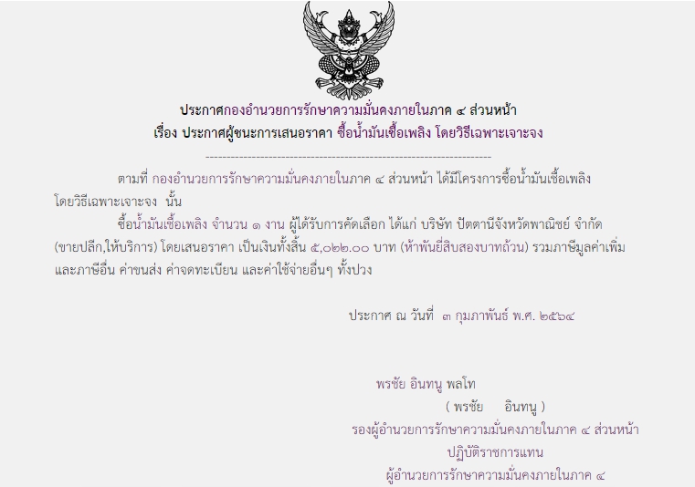 จัดซื้อ จัดจ้างประกาศผู้ชนะการเสนอราคา ประกาศผู้ชนะการเสนอราคา ซื้อน้ำมันเชื้อเพลิง โดยวิธีเฉพาะเจาะจง (5,022.00) February 19, 2021 878 Share Facebook Twitter Google+ Telegram LINE สกบ.กอ.รมน.ภาค 4 สน.