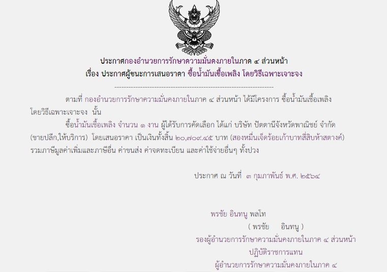 ประกาศผู้ชนะการเสนอราคา ซื้อน้ำมันเชื้อเพลิง โดยวิธีเฉพาะเจาะจง (20,709.45)