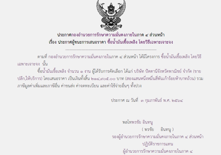 ประกาศผู้ชนะการเสนอราคา ซื้อน้ำมันเชื้อเพลิง โดยวิธีเฉพาะเจาะจง (214,905.00)