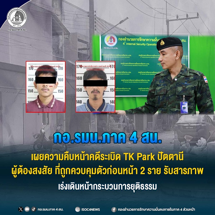 วันนี้ (1 เมษายน 2569) พันเอก เอกวริทธิ์ ชอบชูผล รองโฆษกกองอำนวยการรักษาความมั่นคงภายในภาค 4 ส่วนหน้า เปิดเผยความคืบหน้าคดีเหตุลอบวางระเบิดบริเวณ TK Park อำเภอเมือง จังหวัดปัตตานี ซึ่งเกิดขึ้นเมื่อวันที่ 13 มกราคม 2568 และส่งผลกระทบต่อความเชื่อมั่นด้านความปลอดภัยของประชาชนในพื้นที่
