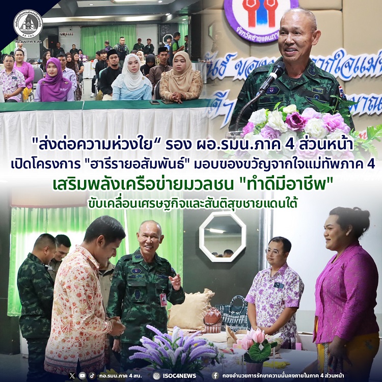 วันที่ 1 เมษายน 2569 เวลา 11.00 น. ณ ห้องประชุมวังแก้ว ชั้น 1 โรงแรมยะลาแกรนด์พาเลซ อำเภอเมือง จังหวัดยะลา พลตรี กรกฎ ภู่โชติ รองแม่ทัพภาคที่ 4 / รองผู้อำนวยการรักษาความมั่นคงภายในภาค 4 ส่วนหน้า เป็นประธานมอบของขวัญจากใจแม่ทัพภาคที่ 4 สู่เครือข่ายมวลชนทำดีมีอาชีพ ประจำปีงบประมาณ 2569 เพื่อสร้างขวัญและกำลังใจ พร้อมมอบสิ่งของอุปโภคบริโภคให้แก่สมาชิกเครือข่ายนำไปใช้ประโยชน์ และเป็นการสื่อสารถึงความห่วงใยของ พลโท นรธิป โพยนอก แม่ทัพภาคที่ 4 / ผู้อำนวยการรักษาความมั่นคงภายในภาค 4 ที่มีต่อเครือข่ายมวลชนกลุ่มทำดีมีอาชีพ โดยมี นายมูฮัมมัด ศานติภิมุข รองผู้ว่าราชการจังหวัดยะลา พร้อมด้วย นายอภิหนึ่ง เลขะสม ผู้อำนวยการกลุ่มทำดีมีอาชีพ หัวหน้าส่วนราชการ และสมาชิกกลุ่มทำดีมีอาชีพในพื้นที่ร่วมกิจกรรมอย่างพร้อมเพรียง