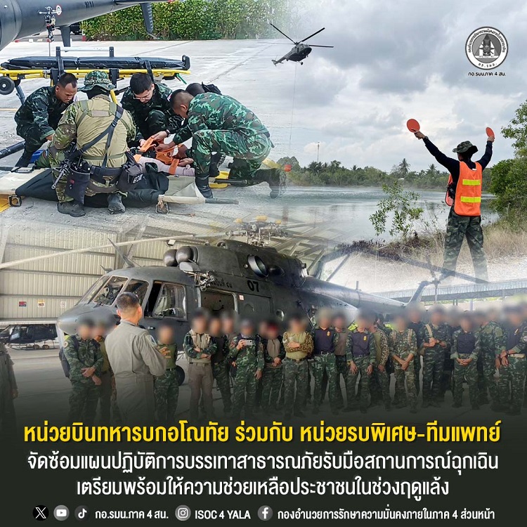 ปัตตานี – เมื่อวันที่ 31 มีนาคม 2569 เวลา 09.00 น. ณ กองร้อยลาดตระเวนระยะไกล กองพลทหารราบที่ 15 (ร้อย.ลว.ไกล พล.ร.15) ค่ายสมเด็จพระสุริโยทัย ต.บ่อทอง อ.หนองจิก จ.ปัตตานี หน่วยบินทหารบกอโณทัย ยกระดับความพร้อมขั้นสูงสุด จัดฝึกซ้อมแผนบรรเทาสาธารณภัยเชิงรุกบูรณาการร่วมกับ หมวดลาดตระเวนระยะไกลป่าภูเขา และ ศูนย์แพทย์จังหวัดชายแดนภาคใต้ เพื่อเตรียมความพร้อมรับมืออัคคีภัยและภัยแล้งในพื้นที่ทุรกันดาร