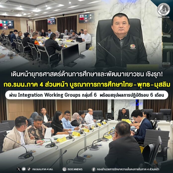 วันนี้ (1 เมษายน 2569) เวลา 09.30 น. ณ ห้องประชุมสำนักงานการศึกษาเอกชน พลตรี อนุชา โนนคู่เขตโขง ผู้อำนวยการส่วนพัฒนายุทธศาสตร์ กองอำนวยการรักษาความมั่นคงภายในภาค 4 ส่วนหน้า เป็นประธานในการประชุม คณะทำงานบูรณาการด้านการศึกษาและพัฒนาเยาวชน (IWG 6) เร่งขับเคลื่อนศาลงานสำคัญเร่งด่วนประจำปี 2569 เพื่อติดตามผลการปฏิบัติงานและวางกรอบยุทธศาสตร์เชิงรุก มุ่งยกระดับคุณภาพชีวิตเยาวชนควบคู่การสร้างสันติสุขอย่างยั่งยืน โดยมีผู้แทนจาก ศูนย์อำนวยการบริหารจังหวัดชายแดนภาคใต้ ศูนย์ขับเคลื่อนการศึกษาในจังหวัดชายแดนภาคใต้ หน่วยเฉพาะกิจสันติสุข และผู้แทนหน่วยงานการศึกษาจากจังหวัดชายแดนภาคใต้ เข้าร่วมประชุมทั้งในพื้นที่และผ่านระบบออนไลน์