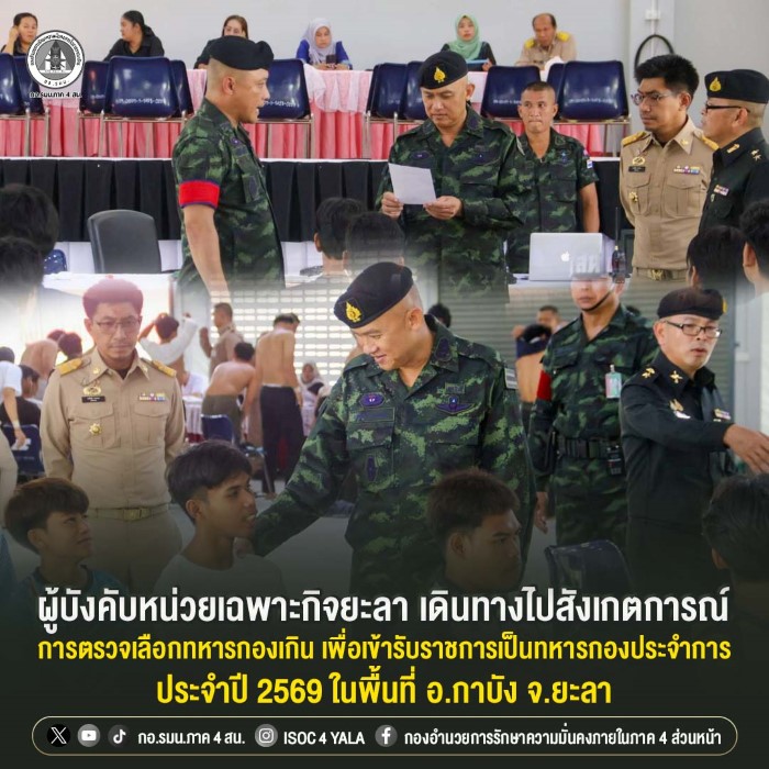 วันที่ 1 เมษายน 2569 เวลา 10.00 น. พลตรีอภินันท์ แจ่มแจ้ง ผู้บังคับหน่วยเฉพาะกิจยะลา เดินทางไปตรวจเยี่ยมและให้กำลังใจ ผู้เข้ารับการตรวจเลือกทหารกองเกิน เข้ารับราชการเป็นทหารกองประจำการ ประจำปี 2569 ในพื้นที่อำเภอกาบัง จังหวัดยะลา โดยได้ร่วมสังเกตการณ์ ขั้นตอนในการตรวจเลือก และได้แนะนำ แนวทางในการดำเนินการเกี่ยวกับขั้นตอนต่างๆ และการปฏิบัติ ให้กับเจ้าหน้าที่ในส่วนของคณะกรรมการตรวจเลือกทหารกองเกิน ประจำจังหวัดยะลา