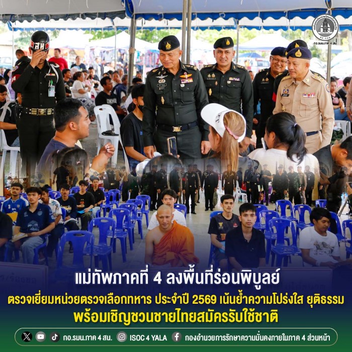 เมื่อวันที่ 2 เมษายน 2569 เวลา 13.00 น. ณ ศาลาประชาคม ที่ว่าการอำเภอร่อนพิบูลย์ จังหวัดนครศรีธรรมราช พลโท นรธิป โพยนอก แม่ทัพภาคที่ 4 / ผู้อำนวยการรักษาความมั่นคงภายในภาค 4 พร้อมด้วยคณะผู้บังคับบัญชา เดินทางลงพื้นที่เพื่อตรวจเยี่ยมและสังเกตการณ์กระบวนการตรวจเลือกทหารกองเกินเข้ารับราชการทหารกองประจำการ ประจำปี 2569 ของพื้นที่อำเภอร่อนพิบูลย์