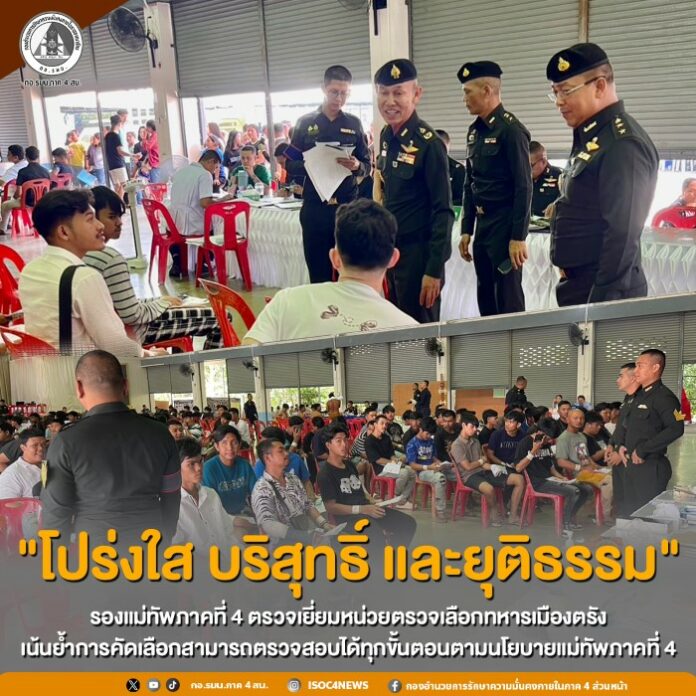 เมื่อวันที่ 4 เมษายน 2569 เวลา 10.30 น. ณ โรงเรียนเทศบาล 6 วัดตันตยาภิรมย์ อำเภอเมือง จังหวัดตรัง พลตรี กรกฎ ภู่โชติ รองแม่ทัพภาคที่ 4 / รองผู้อำนวยการรักษาความมั่นคงภายในภาค 4 ส่วนหน้า พร้อมด้วยคณะผู้บังคับบัญชา เดินทางลงพื้นที่เพื่อตรวจเยี่ยมและสังเกตการณ์กระบวนการตรวจเลือกทหารกองเกินเข้ารับราชการทหารกองประจำการ ประจำปี 2569 ในพื้นที่จังหวัดตรัง คณะที่ 1 โดยมี พันเอก วรฉัตร แสงสมบุญ ผู้บังคับกองพันซ่อมบำรุงที่ 24 กองบัญชาการช่วยรบที่ 4 ในฐานะประธานกรรมการตรวจเลือกฯ จังหวัดตรัง คณะที่ 1 ให้การต้อนรับและนำตรวจติดตามขั้นตอนการปฏิบัติงาน