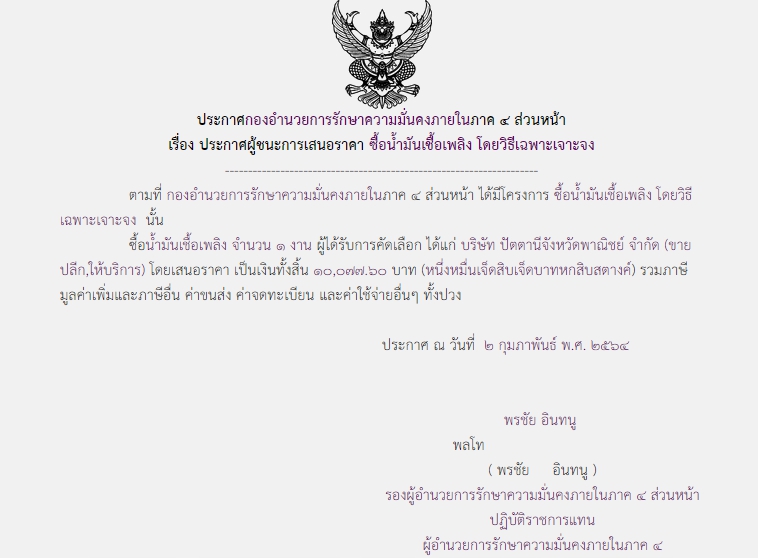 ประกาศผู้ชนะการเสนอราคา ซื้อน้ำมันเชื้อเพลิง โดยวิธีเฉพาะเจาะจง (10,077.60)