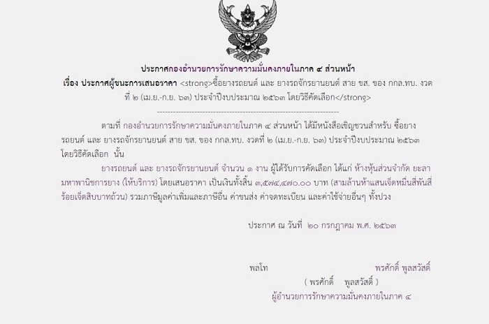 จัดซื้อ จัดจ้างประกาศผู้ชนะการเสนอราคา ประกาศผู้ชนะการเสนอราคา ซื้อยางรถยนต์และรถจักรยานยนต์สาย ขส.ของ กกล.ทบ.งวดที่๒ เม.ย.-ก.ย.๖๓ โดยวิธีเฉพาะเจาะจง July 20, 2020 1237 Share Facebook Twitter Google+ Telegram LINE