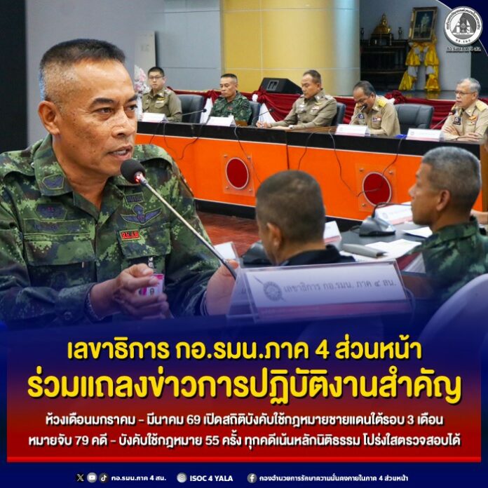วันที่ 6 เมษายน 2569 ที่ศูนย์ปฏิบัติการสำนักงานตำรวจแห่งชาติส่วนหน้า / กองกำลังตำรวจจังหวัดชายแดนภาคใต้ หน่วยในพื้นที่ ร่วมแถลงผลการปฏิบัติงานเชิงรุก ห้วงเดือนมกราคม- มีนาคม 69 เกี่ยวผลบังคับใช้กฎหมายในพื้นที่จังหวัดชายแดนภาคใต้ โดยมี พลตำรวจโท ปิยะวัฒน์ เฉลิมศรี ผู้บัญชาการตำรวจภูธรภาค 9, พลตรี เฉลิมพงค์ คงบัว เลขาธิการกองอำนวยการรักษาความมั่นคงภายในภาค 4 ส่วนหน้า, นายนันทพงศ์ สุวรรณรัตน์ รองเลขาธิการ ศูนย์อำนวยการบริหารจังหวัดชายแดนภาคใต้ และ นายก้องสกุล จันทราช ผู้ว่าราชการจังหวัดยะลา ร่วมแถลงผลการปฏิบัติการบังคับใช้กฎหมายด้านความมั่นคงในพื้นที่
