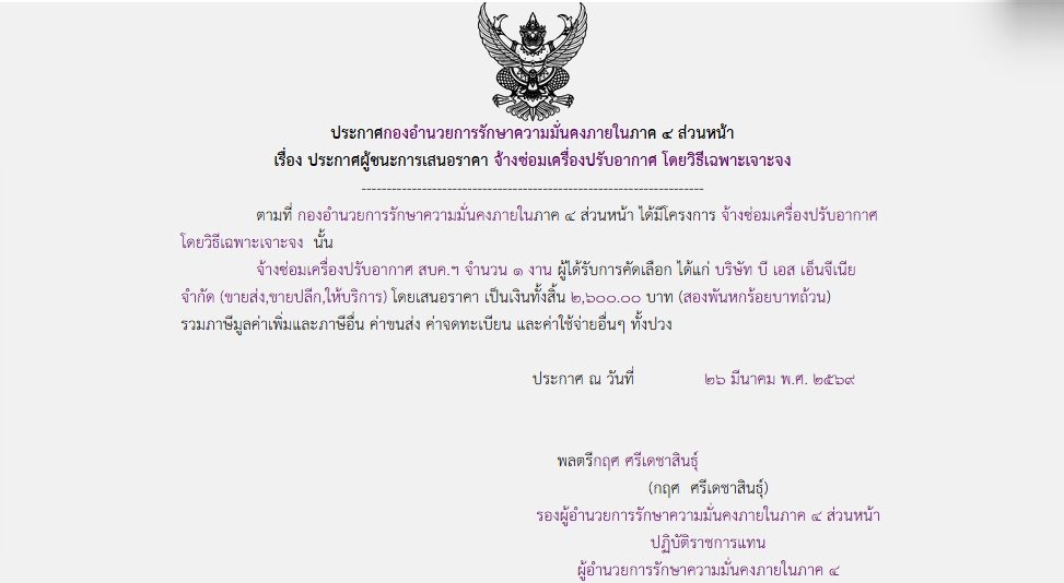 ประกาศผู้ชนะการเสนอราคา จ้างซ่อมเครื่องปรับอากาศ โดยวิธีเฉพาะเจาะจง