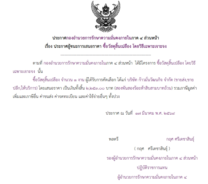 ประกาศผู้ชนะการเสนอราคา ซื้อวัสดุสิ้นเปลือง โดยวิธีเฉพาะเจาะจง