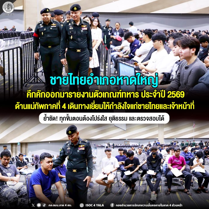 วันนี้ (8 เมษายน 2569) เวลา 10.30 น. ณ หาดใหญ่ฮอลล์ ชั้น 5 ศูนย์การค้าเซ็นทรัล หาดใหญ่ อำเภอหาดใหญ่ จังหวัดสงขลา พลโท นรธิป โพยนอก แม่ทัพภาคที่ 4 / ผู้อำนวยการรักษาความมั่นคงภายในภาค 4 เดินทางตรวจเยี่ยมการตรวจเลือกทหารกองเกิน เพื่อเข้ารับราชการทหารกองประจำการ ประจำปี 2569 ของพื้นที่อำเภอหาดใหญ่ จังหวัดสงขลา เพื่อสร้างขวัญและกำลังใจ ท่ามกลางบรรยากาศการเกณฑ์ทหารที่เป็นไปด้วยความเรียบร้อย โดยมีชายไทยเข้ารับการคัดเลือกเป็นจำนวนมาก พร้อมด้วยผู้ปกครอง และเจ้าหน้าที่ดูแลอย่างใกล้ชิด