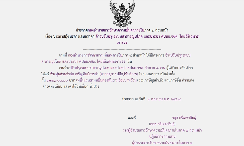 ประกาศผู้ขนะการเสนอราคา จ้างปรับปรุงระบบสาธารณูบโภค และประปา ศปนย.จชต. โดยวิธีเฉพาะ เจาะจง