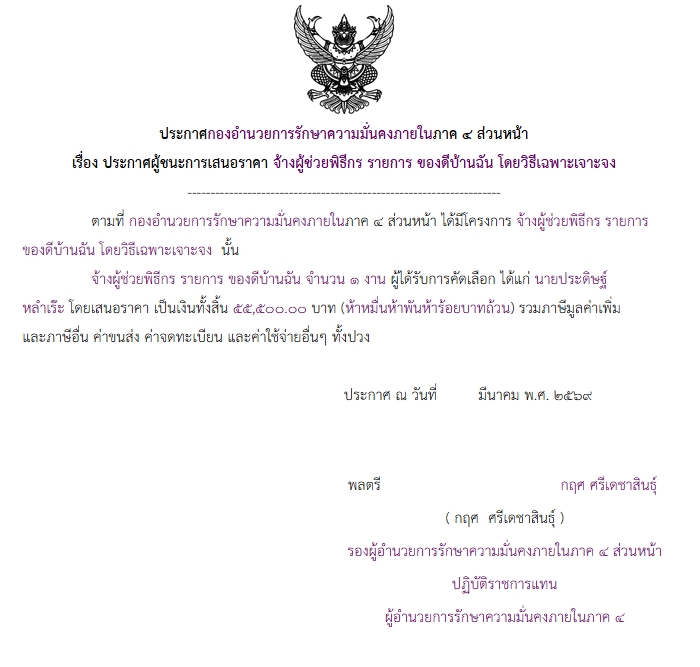 จัดซื้อ จัดจ้างประกาศผู้ชนะการเสนอราคา ประกาศ กองอํานวยการรักษาความมั่นคงภายในภาค ๔ ส่วนหน้า เรื่อง ประกาศผู้ชนะการเสนอราคา จ้างผู้ช่วยพิธีกร รายการ ของดีบ้านฉัน โดยวิธีเฉพาะเจาะจง April 9, 2026 6 Share Facebook Twitter Google+ Telegram LINE