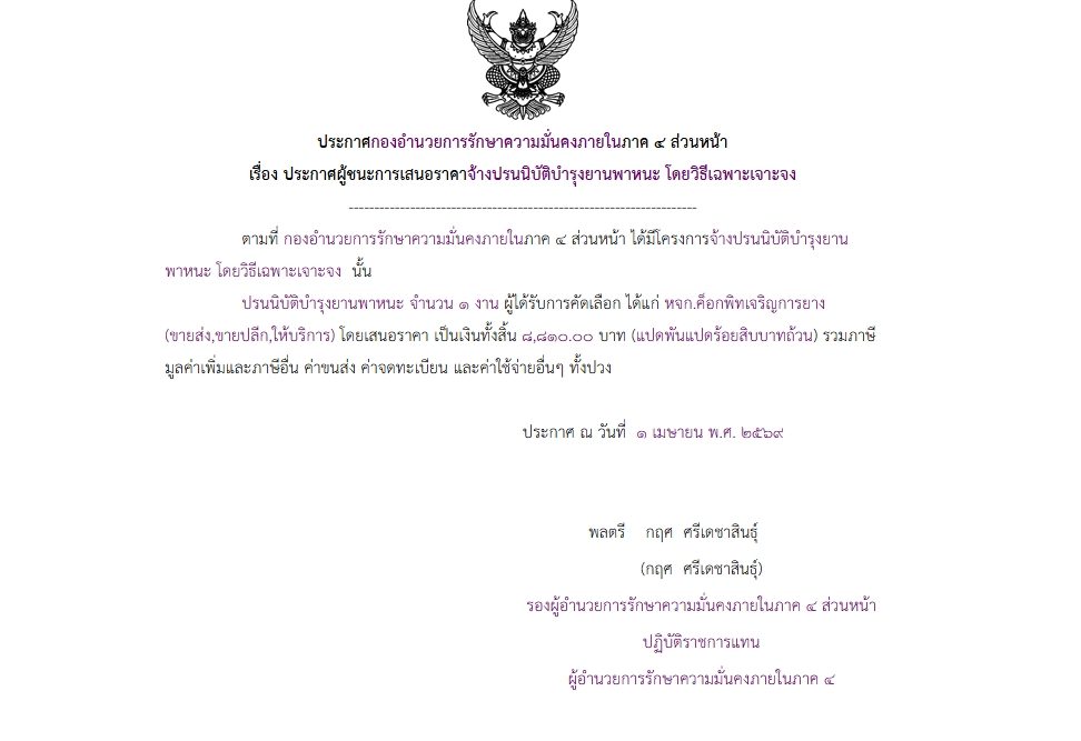 จัดซื้อ จัดจ้างประกาศผู้ชนะการเสนอราคา ประกาศ กองอํานวยการรักษาความมั่นคงภายในภาค ๔ ส่วนหน้า เรื่อง ประกาศผู้ชนะการเสนอราคา จ้างปรนนิบัติบำรุงยานพาหนะ โดยวิธีเฉพาะเจาะจง April 9, 2026 12 Share Facebook Twitter Google+ Telegram LINE