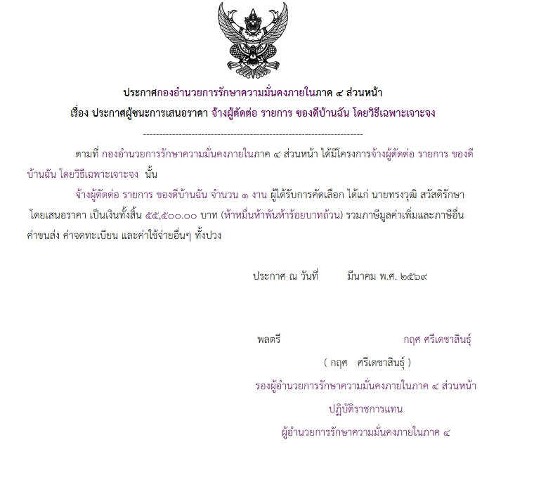 จัดซื้อ จัดจ้างประกาศผู้ชนะการเสนอราคา ประกาศ กองอํานวยการรักษาความมั่นคงภายในภาค ๔ ส่วนหน้า เรื่อง ประกาศผู้ชนะการเสนอราคา จ้างผู้ตัดต่อ รายการ ของดีบ้านฉัน โดยวิธีเฉพาะเจาะจง April 9, 2026 4 Share Facebook Twitter Google+ Telegram LINE