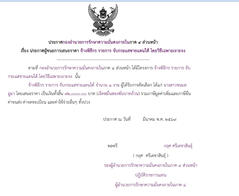 จัดซื้อ จัดจ้างประกาศผู้ชนะการเสนอราคา ประกาศ กองอํานวยการรักษาความมั่นคงภายในภาค ๔ ส่วนหน้า เรื่อง ประกาศผู้ชนะการเสนอราคา จ้างพิธีกร รายการ จับกระแสชายแดนใต้ โดยวิธีเฉพาะเจาะจง April 9, 2026 4 Share Facebook Twitter Google+ Telegram LINE