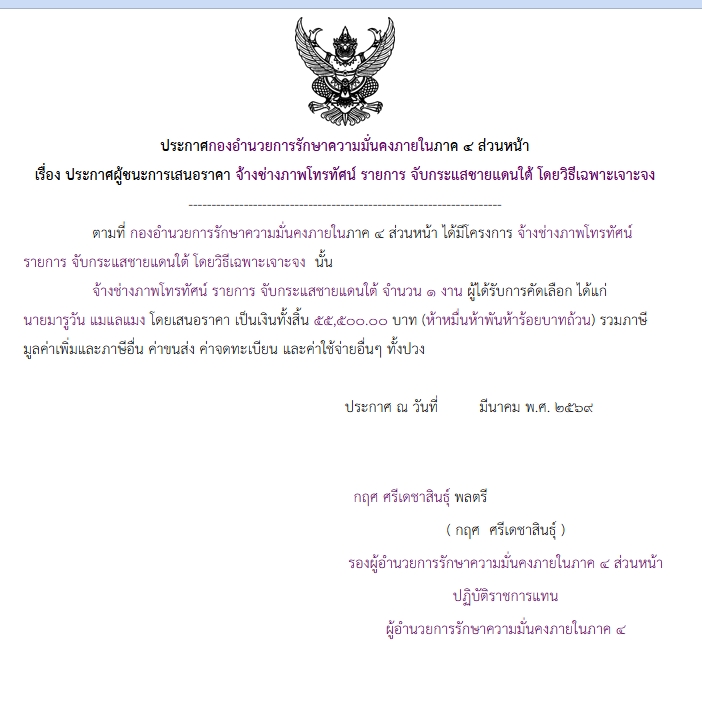 จัดซื้อ จัดจ้างประกาศผู้ชนะการเสนอราคา ประกาศ กองอํานวยการรักษาความมั่นคงภายในภาค ๔ ส่วนหน้า เรื่อง ประกาศผู้ชนะการเสนอราคา จ้างช่างภาพโทรทัศน์ รายการ จับกระแสชายแดนใต้ โดยวิธีเฉพาะเจาะจง April 9, 2026 5 Share Facebook Twitter Google+ Telegram LINE
