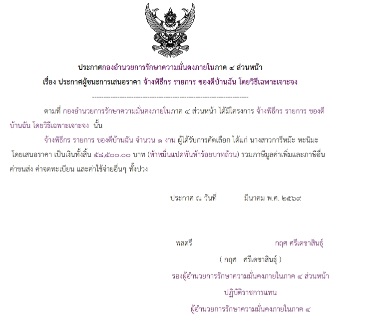 จัดซื้อ จัดจ้างประกาศผู้ชนะการเสนอราคา ประกาศ กองอํานวยการรักษาความมั่นคงภายในภาค ๔ ส่วนหน้า เรื่อง ประกาศผู้ชนะการเสนอราคา จ้างพิธีกร รายการ ของดีบ้านฉัน โดยวิธีเฉพาะเจาะจง April 9, 2026 9 Share Facebook Twitter Google+ Telegram LINE