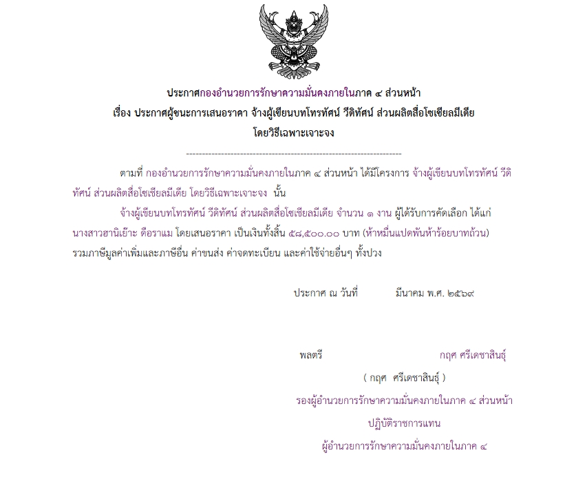 จัดซื้อ จัดจ้างประกาศผู้ชนะการเสนอราคา ประกาศ กองอํานวยการรักษาความมั่นคงภายในภาค ๔ ส่วนหน้า เรื่อง ประกาศผู้ชนะการเสนอราคา จ้างผู้เขียนบทโทรทัศน์ วีดิทัศน์ ส่วนผลิตสื่อโซเชียลมีเดีย โดยวิธีเฉพาะเจาะจง April 9, 2026 11 Share Facebook Twitter Google+ Telegram LINE
