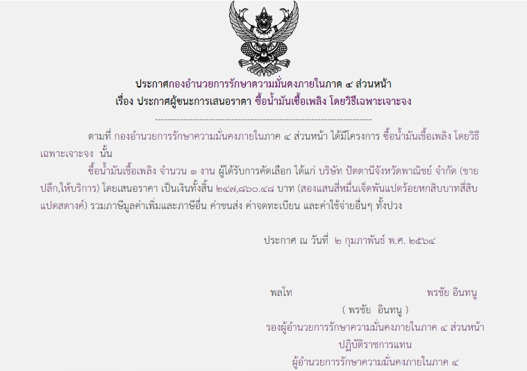 จัดซื้อ จัดจ้างประกาศผู้ชนะการเสนอราคา ประกาศผู้ชนะการเสนอราคา ซื้อน้ำมันเชื้อเพลิง โดยวิธีเฉพาะเจาะจง (247,860.48) February 20, 2021 772 Share Facebook Twitter Google+ Telegram LINE สกบ.กอ.รมน.ภาค 4 สน.