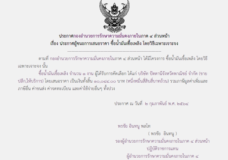 ประกาศผู้ชนะการเสนอราคา ซื้อน้ำมันเชื้อเพลิง โดยวิธีเฉพาะเจาะจง (10,044.00)