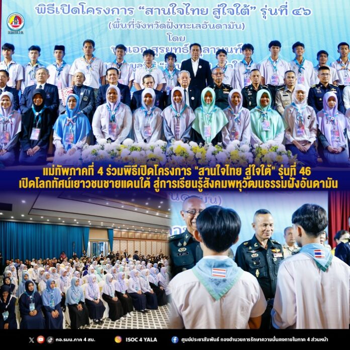 เมื่อวันที่ 9 เมษายน 2569 เวลา 14.00 น. ณ ห้องประชุมไหมฟ้า โรงแรมเลอ เอราวัณพังงา อำเภอเมือง จังหวัดพังงา พลโท นรธิป โพยนอก แม่ทัพภาคที่ 4 / ผู้อำนวยการรักษาความมั่นคงภายในภาค 4 ร่วมเป็นเกียรติในพิธีเปิดโครงการ “สานใจไทย สู่ใจใต้” รุ่นที่ 46 (พื้นที่ฝั่งทะเลอันดามัน) โดยมี พลเอก สุรยุทธ์ จุลานนท์ นายกมูลนิธิสานใจไทย สู่ใจใต้ เป็นประธานในพิธี ซึ่งโครงการดังกล่าวจัดขึ้นเพื่อเปิดโอกาสให้เยาวชนอายุระหว่าง 15–19 ปี จาก 5 จังหวัดชายแดนภาคใต้ ซึ่งเป็นกลุ่มที่อาจได้รับผลกระทบจากสถานการณ์ความรุนแรงในพื้นที่ หรือขาดโอกาสทางสังคม ได้ออกเดินทางมาเปิดโลกการเรียนรู้ ผ่านการแลกเปลี่ยนประสบการณ์ในสังคมที่มีความหลากหลายทางวัฒนธรรม