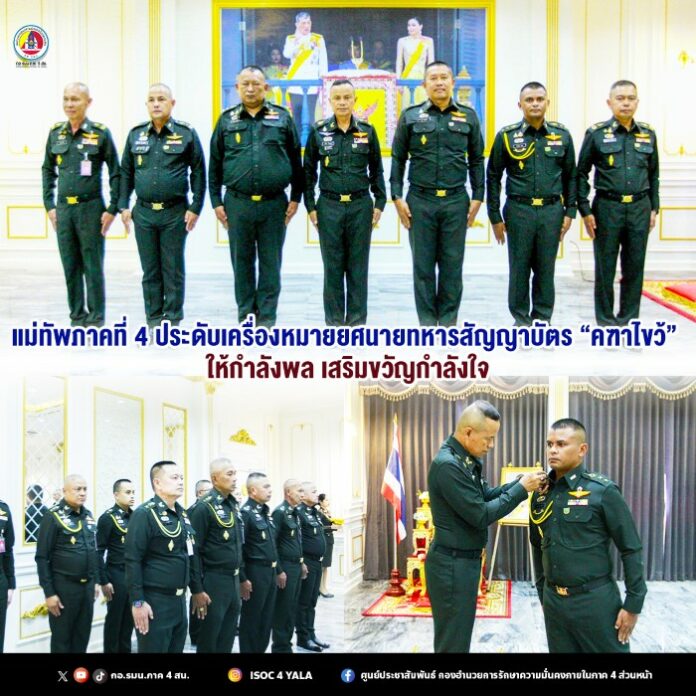 วันที่ 9 เมษายน 2569 เวลา 09.30 น. ณ ห้องหาญ ลีนานนท์ กองบัญชาการกองทัพภาคที่ 4 ค่ายวชิราวุธ อำเภอเมือง จังหวัดนครศรีธรรมราช พลโท นรธิป โพยนอก แม่ทัพภาคที่ 4 / ผู้อำนวยการรักษาความมั่นคงภายในภาค 4 เป็นประธานในพิธีประดับเครื่องหมายยศนายทหารสัญญาบัตร “คฑาไขว้” ให้แก่กำลังพลที่ได้รับการเลื่อนยศ เพื่อเป็นเกียรติยศและสร้างขวัญกำลังใจในการปฏิบัติหน้าที่รับใช้ประเทศชาติ ซึ่ง มีกำลังพลในสังกัดกองทัพภาคที่ 4 เข้ารับการประดับเครื่องหมายยศ จำนวน 3 นาย ได้แก่ พันเอก ธานี เกียรติสาร ผู้บังคับการกรมทหารราบที่ 152 , พันเอก อรรถพล คงสง นายทหารฝ่ายเสนาธิการกองทัพภาคที่ 4 และ พันเอก เจษฎา ปิยะสุวรรณ นายทหารปฏิบัติการประจำมณฑลทหารบกที่ 41 โดยมีผู้บังคับบัญชาและกำลังพลร่วมแสดงความยินดีอย่างพร้อมเพรียง