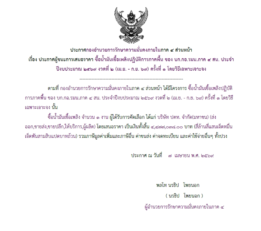 จัดซื้อ จัดจ้างประกาศผู้ชนะการเสนอราคา ประกาศผู้ชนะการเสนอราคา ซื้อน้ำมันเชื้อเพลิงปฏิบัติการภาคพื้น ของ บก.กอ.รมน.ภาค ๔ สม. ประจำ ปีงบประมาณ ๒๕๖๙ งวดที่ ๒ (เม.ย. – ก.ย. ๖๙) ครั้งที่ ๑ โดยวิธีเฉพาะเจาะจง April 10, 2026 8 Share Facebook Twitter Google+ Telegram LINE
