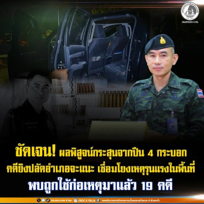 วันนี้ (10 เมษายน 2569 ) พันเอก เอกวริทธิ์ ชอบชูผล รองโฆษกกองอำนวยการรักษาความมั่นคงภายในภาค 4 ส่วนหน้า เปิดเผยว่า จากเหตุลอบยิงปลัดอำเภอจะแนะ เมื่อวันที่ 1 เมษายน 2569 จากการตรวจพิสูจน์ปลอกกระสุนพบว่าใช้อาวุธปืนอย่างน้อย 4 ชนิด รวม 94 นัด โดยทุกกระบอกมีประวัติเคยถูกใช้ก่อเหตุมาแล้วในหลายคดี จากการตรวจสอบจำแนกอาวุธที่ใช้ก่อเหตุ พบรายละเอียดสำคัญดังนี้