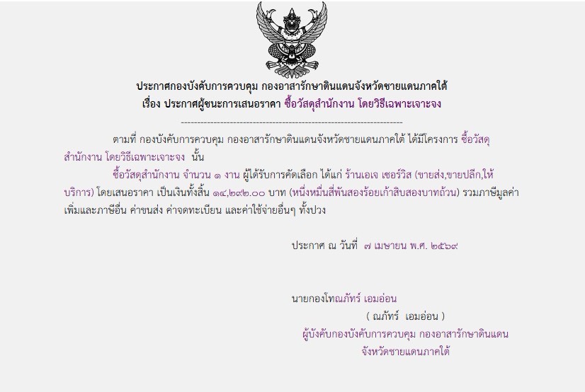 จัดซื้อ จัดจ้างประกาศผู้ชนะการเสนอราคา ประกาศกองบังคับการควบคุม กองอาสารักษาดินแดนจังหวัดชายแดนภาคใต้ เรื่อง ประกาศผู้ชนะการเสนอราคา ซื้อวัสดุสำนักงาน โดยวิธีเฉพาะเจาะจง April 10, 2026 11 Share Facebook Twitter Google+ Telegram LINE