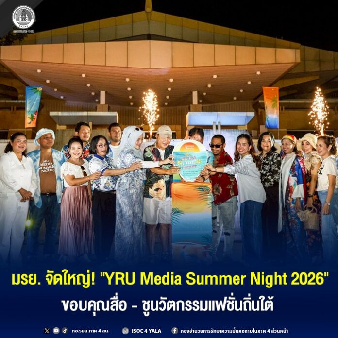 มหาวิทยาลัยราชภัฏยะลา ยกระดับงานขอบคุณสื่อมวลชนสู่รันเวย์ ในงาน “YRU Media Summer Night 2026” ชูไฮไลต์แฟชั่นโชว์จากงานวิจัยและนวัตกรรมอัตลักษณ์ท้องถิ่น ผสานความคิดสร้างสรรค์ร่วมสมัย พร้อมกระชับความสัมพันธ์อันดี และมอบรางวัลเชิดชูเกียรติแก่สื่อมวลชน