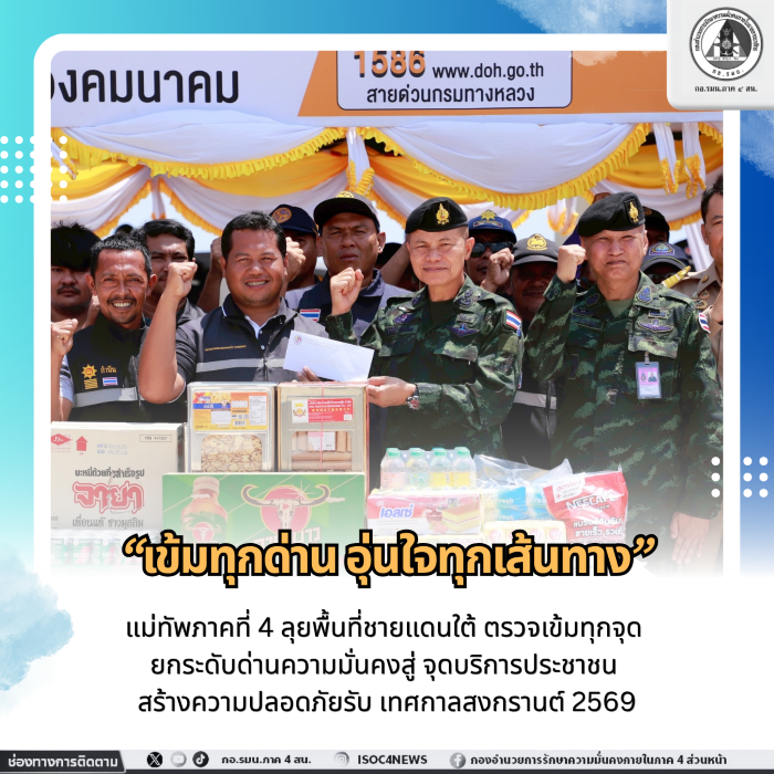 วันนี้ (12 เมษายน 2569) พลโท นรธิป โพยนอก แม่ทัพภาคที่ 4 / ผู้อำนวยการรักษาความมั่นคงภายในภาค 4 พร้อมคณะผู้บังคับบัญชา ลงพื้นที่ตรวจเยี่ยมจุดบริการประชาชนในห้วงวันหยุด เทศกาลสงกรานต์ ประจำปี 2569 ณ พื้นที่จังหวัดชายแดนภาคใต้ ประกอบด้วย จุดบริการประชาชนเกาะสะบ้า และจุดพักรถหาดสะกอม อำเภอเทพา จังหวัดสงขลา, จุดตรวจดอนรัก อำเภอเมือง จังหวัดปัตตานี, จุดตรวจที่ว่าการอำเภอระแงะ จังหวัดนราธิวาส และด่านตรวจท่าสาป อำเภอเมือง จังหวัดยะลา โดยมี ผู้บังคับหน่วยในพื้นที่ หัวหน้าส่วนราชการ ผู้นำท้องที่ ผู้นำท้องถิ่น และเจ้าหน้าที่ร่วมให้การต้อนรับ