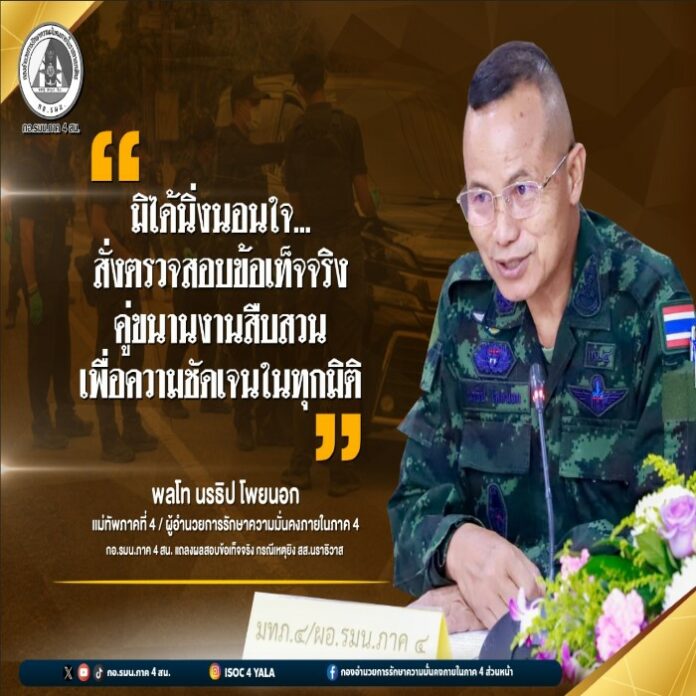 ประชาสัมพันธ์ข่าวประชาสัมพันธ์ “มิได้นิ่งนอนใจ… สั่งตรวจสอบข้อเท็จจริง คู่ขนานงานสืบสวน เพื่อความชัดเจนในทุกมิติ” April 13, 2026 13 Share Facebook Twitter Google+ Telegram LINE — พลโท นรธิป โพยนอก — แม่ทัพภาคที่ 4 / ผู้อำนวยการรักษาความมั่นคงภายในภาค 4 แม่ทัพภาคที่4 กองอำนวยการรักษาความมั่นคงภายในภาค4ส่วนหน้า