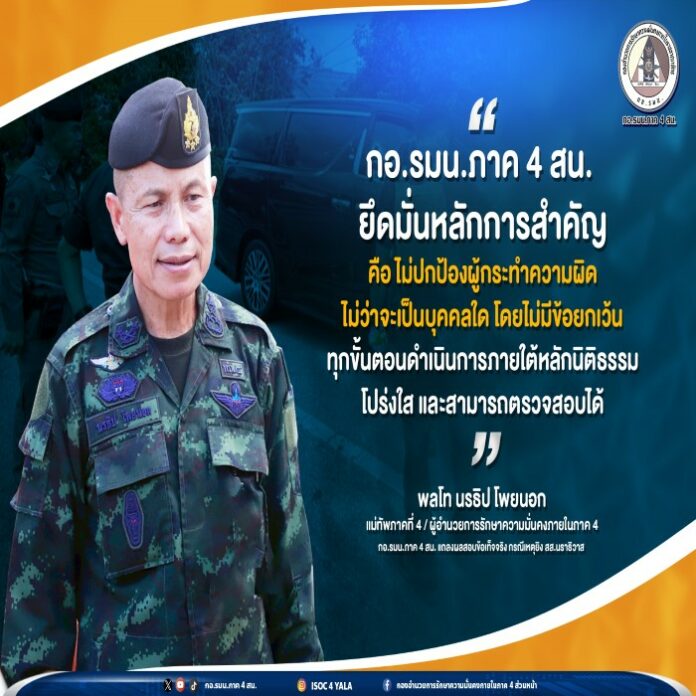 ประชาสัมพันธ์ข่าวประชาสัมพันธ์ “กอ.รมน.ภาค 4 สน. ยึดมั่นหลักการสำคัญ คือ ไม่ปกป้องผู้กระทำความผิด ไม่ว่าจะเป็นบุคคลใด โดยไม่มีข้อยกเว้น โดยทุกขั้นตอนดำเนินการภายใต้หลักนิติธรรม โปร่งใส และสามารถตรวจสอบได้” April 13, 2026 12 Share Facebook Twitter Google+ Telegram LINE พลโท นรธิป โพยนอก แม่ทัพภาคที่ 4 / ผู้อำนวยการรักษาความมั่นคงภายในภาค 4 แม่ทัพภาคที่4 กองอำนวยการรักษาความมั่นคงภายในภาค4ส่วนหน้า