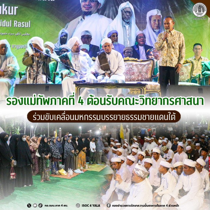 เมื่อวันที่ 13 เมษายน 2569 เวลา 18:00 น. พลตรี ชาคริต อุจะรัตน รองแม่ทัพภาคที่ 4 / รองผู้อำนวยการรักษาความมั่นคงภายในภาค 4 ส่วนหน้า ให้การต้อนรับ ฮาบีบ ยินดัน บิน โนฟุน พร้อมด้วย ฮาบีบ มุจตาบา บิน ซีฮัจ และคณะ ณ โรงแรมซีเอส ปัตตานี เนื่องในโอกาสเดินทางมาร่วมบรรยายธรรมในกิจกรรม “มหกรรมบรรยายธรรม 3 จังหวัดชายแดนภาคใต้” ซึ่งจัดขึ้นระหว่างวันที่ 11–13 เมษายน 2569 โดยบรรยากาศเป็นไปอย่างอบอุ่นและเป็นกันเอง