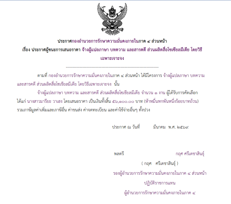 ประกาศผู้ชนะการเสนอราคา จ้างผู้แปลภาษา บทความ และสารคดี ส่วนผลิตสื่อโซเซียลมีเดีย โดยวิธี เฉพาะเจาะจง