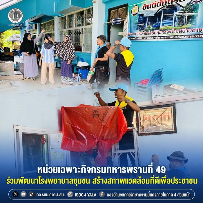 เมื่อวันที่ 14 เมษายน 2569 เวลา 09.00 น. หน่วยเฉพาะกิจกรมทหารพรานที่ 49 นำโดย ร้อยเอก สุภาพ มณีฉาย ผู้บังคับกองร้อยทหารพรานที่ 4912 กำลังพลชุดปฏิบัติการกิจการพลเรือน และกำลังพลจิตอาสาของหน่วย ร่วมกับเจ้าหน้าที่โรงพยาบาลส่งเสริมสุขภาพตำบลบ้านลาเวง ตำบลเชิงคีรี อำเภอศรีสาคร จังหวัดนราธิวาส ซึ่งได้ร่วมกันพัฒนาปรับปรุงภูมิทัศน์ของโรงพยาบาลส่งเสริมสุขภาพตำบลบ้านตามุง โดยมีการทาสีอาคารทั้งภายในและภายนอก เพื่อให้สถานพยาบาลมีความสะอาด สวยงาม และเอื้อต่อการให้บริการประชาชนในพื้นที่