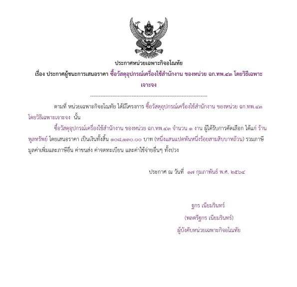 ประกาศผู้ชนะการเสนอราคา ซื้อวัสดุอุปกรณ์เครื่องใช้สำนักงาน ของหน่วย ฉก.ทพ.๔๓ โดยวิธีเฉพาะเจาะจง (108,130.00)