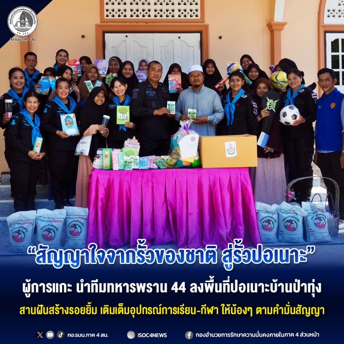 เมื่อวันที่ 16 เมษายน 2569 พันเอก ณัฐวุฒิ ศรีสังข์ หรือผู้การแกะ ผู้บังคับหน่วยเฉพาะกิจกรมทหารพรานที่ 44 ได้เดินทางลงพื้นที่สถาบันปอเนาะมอ์หัด อัตตัรบียาตุลฮะดีซะห์ บ้านป่าทุ่ง ตำบลบางเก่า อำเภอสายบุรี จังหวัดปัตตานี เพื่อทำตามสัญญาใจที่เคยให้ไว้กับเหล่าเยาวชน โดยในครั้งนี้ได้นำอุปกรณ์การเรียน อุปกรณ์กีฬา และเมล็ดพันธุ์พืชมาส่งมอบให้ตามคำร้องขอของน้องๆ ในปอเนาะจากการมาเยี่ยมเยียนเมื่อครั้งก่อน ซึ่งสถาบันปอเนาะแห่งนี้ครั้งหนึ่งเคยได้รับผลกระทบจากการที่กลุ่มผู้ก่อเหตุรุนแรงแอบแฝงเข้ามาใช้พื้นที่สร้างสถานการณ์จนส่งผลต่อความปลอดภัย แต่ด้วยความร่วมมือระหว่างหน่วยเฉพาะกิจกรมทหารพรานที่ 44 ผู้นำท้องที่ ท้องถิ่น และประชาชนในพื้นที่ ที่ได้เข้ามาช่วยกันดูแลและฟื้นฟูอย่างต่อเนื่อง จึงทำให้โรงเรียนกลับมาเป็นพื้นที่ที่ปลอดภัยและเต็มไปด้วยบรรยากาศแห่งการเรียนรู้อีกครั้งในปัจจุบัน