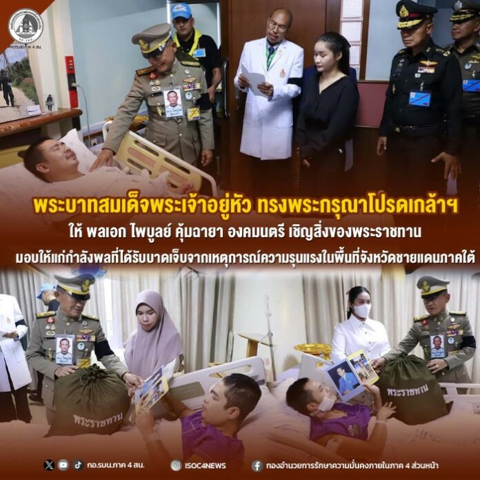 วันนี้ (16 เมษายน 2569) พระบาทสมเด็จพระเจ้าอยู่หัว ทรงพระกรุณาโปรดเกล้าฯ ให้ พลเอก ไพบูลย์ คุ้มฉายา องคมนตรี เดินทางลงพื้นที่จังหวัดชายแดนภาคใต้ ในฐานะผู้แทนพระองค์ เพื่อเชิญสิ่งของพระราชทานและเยี่ยมสร้างขวัญกำลังใจแก่กำลังพลที่ได้รับบาดเจ็บจากเหตุการณ์ความรุนแรงในพื้นที่จังหวัดชายแดนภาคใต้ จำนวน 7 นาย ประกอบด้วย ดาบตำรวจ พิชิตพาล เวชชาชีวี เจ้าหน้าที่ชุดเก็บกู้วัตถุระเบิด (EOD) สังกัดตำรวจภูธรจังหวัดปัตตานี ซึ่งได้รับบาดเจ็บจากเหตุระเบิดขณะปฏิบัติหน้าที่ภายในปั๊มน้ำมัน ปตท. บริเวณหน้าโรงไฟฟ้าตะลุโบะ อำเภอเมือง จังหวัดปัตตานี เมื่อวันที่ 4 กุมภาพันธ์ 2569 และ ร้อยโท วาทิต วัฒนสันติ์, สิบโท ศุภณัฐ พรหมสุทธิ์, อาสาสมัครทหารพราน อนาวิล จินดาพรรณ, อาสาสมัครทหารพราน พงษ์ธร อักษรเงิน, อาสาสมัครทหารพราน อดุลย์ ชัยฤทธิ์ เป็นกำลังพลหน่วยเฉพาะกิจกรมทหารพรานที่ 49 ซึ่งได้รับบาดเจ็บจากเหตุลอบยิง ณ บริเวณบ้านไอลาขอ (บ้านย่อย บ้านไอโซ) หมู่ที่ 5 ตำบลช้างเผือก อำเภอจะแนะ จังหวัดนราธิวาส วันที่ 4 เมษายน 2569 ที่ผ่านมา จากนั้น องคมนตรีได้ตรวจเยี่ยมให้กำลังใจ อาสาสมัครทหารพราน สุริยาวุธ ช่างเกวียนดี กำลังพลหน่วยเฉพาะกิจกรมทหารพรานที่ 48 ที่ได้รับบาดเจ็บจากเหตุคนร้ายลอบวางระเบิดชุดปฏิบัติการรักษาความปลอดภัยเส้นทาง กองร้อยทหารพรานที่ 4811 บ้านบือราแง หมู่ 3 ตำบลโต๊ะเด็ง อำเภอสุไหงปาดี จังหวัดนราธิวาส เมื่อวันที่ 17 กันยายน 2568 โดยทุกนายได้รักษาตัวอยู่ ณ หอผู้ป่วยกระดูกและข้อชาย โรงพยาบาลสงขลานครินทร์ อำเภอหาดใหญ่ จังหวัดสงขลา โดยอาการพ้นขีดอันตรายแล้ว และอยู่ระหว่างการฟื้นฟูร่างกาย โดยมี พลโท นรธิป โพยนอก แม่ทัพภาคที่ 4 / ผู้อำนวยการรักษาความมั่นคงภายในภาค 4 ตลอดจนผู้บังคับบัญชา และทีมแพทย์ ให้การต้อนรับ