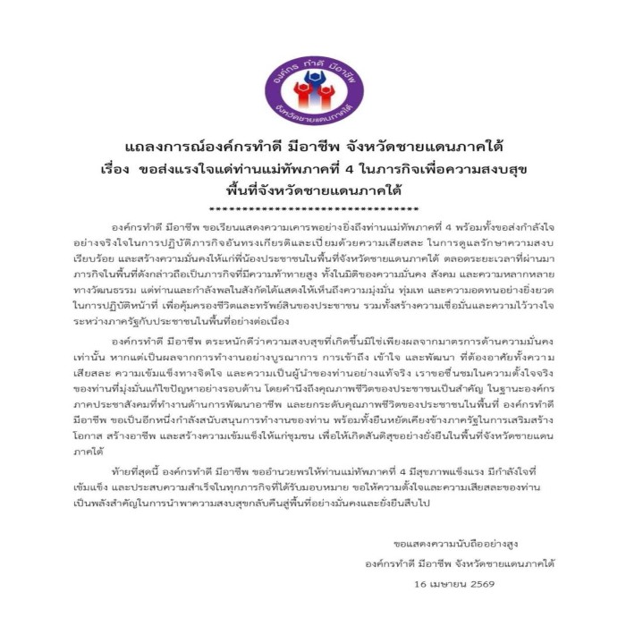 กองอำนวยการรักษาความมั่นคงภายในภาค 4 ส่วนหน้า ขอขอบคุณ “องค์กรทำดี มีอาชีพ จังหวัดชายแดนภาคใต้” สำหรับถ้อยแถลงส่งแรงใจถึง พลโท นรธิป โพยนอก แม่ทัพภาคที่ 4 / ผู้อำนวยการรักษาความมั่นคงภายในภาค 4 ในการปฏิบัติภารกิจเพื่อความสงบสุขของพี่น้องประชาชน